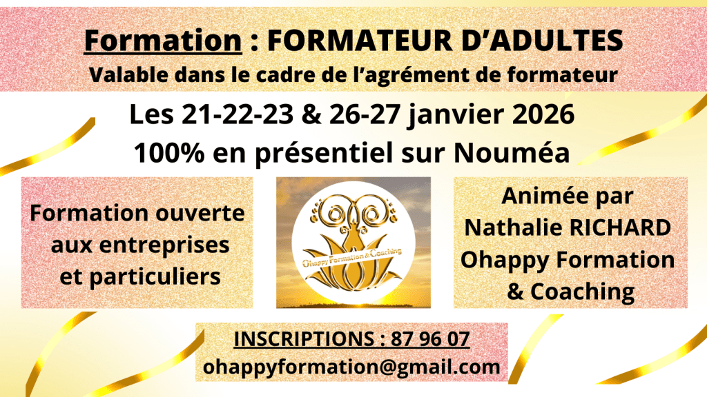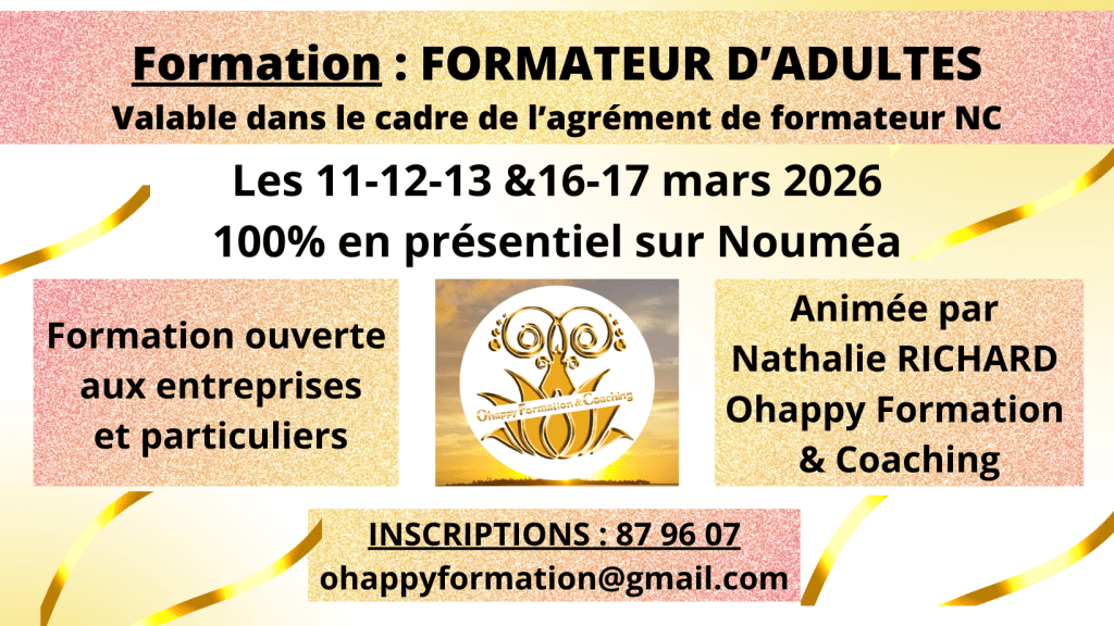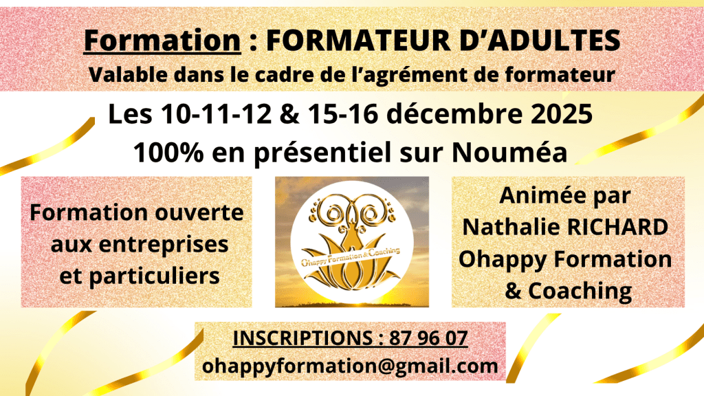 🎓 Participer à la FORMATION de FORMATEUR D’ADULTES 💎 Les 10-11-12 & 15-16 septembre 2025 OU 15-16-17 & 20-21 octobre 2025 OBJECTIFS : 🎯 Concevoir une action de formation 🎯 Animer une séquence de formation 🎯 Assurer le suivi pédagogique des stagiaires 🎯 Evaluer les apprentissages 🤩 En petit groupe de 4 à 6 participants, pour une QUALITE D’APPRENTISSAGE OPTIMALE ! ✨ 100 % en présentiel sur Nouméa